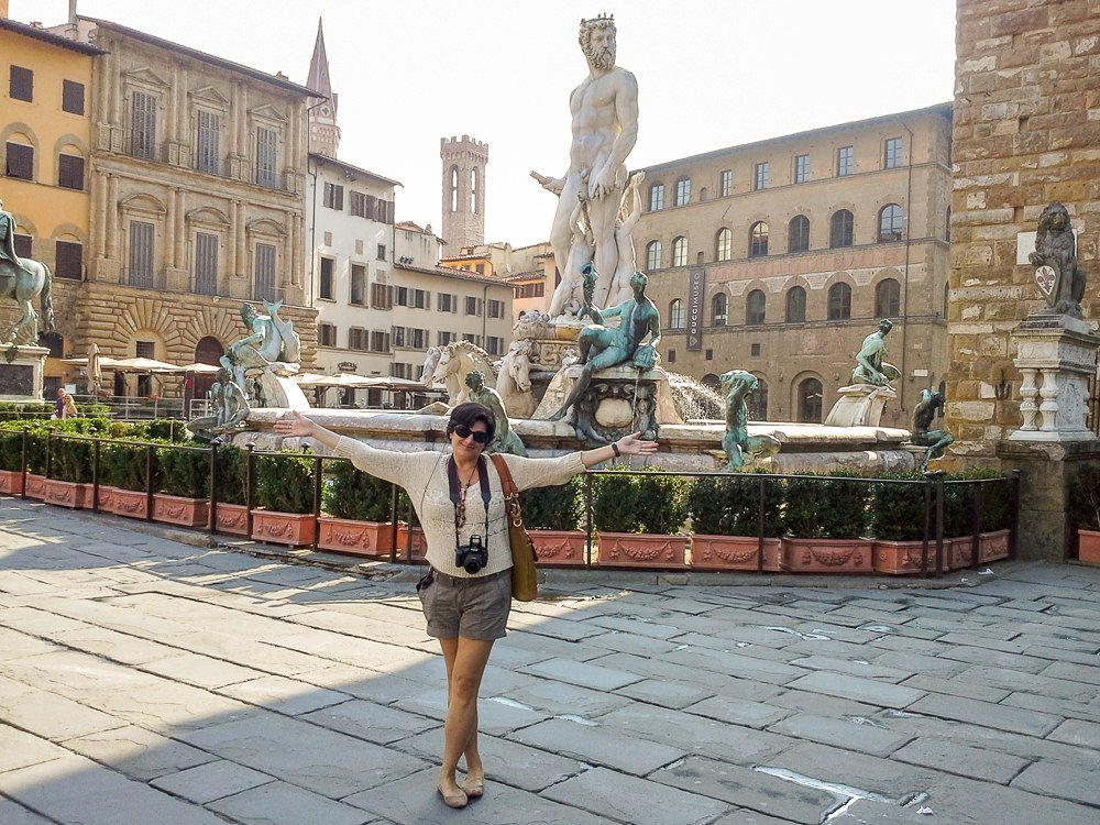 Ainda me lembro do quanto fiquei admirada com isso em minha primeira visita a Florença, numa época em que blogs de viagem ou canais de YouTube e redes sociais não existiam, e descobríamos as coisas de uma forma mais surpreendente. Também tinha menos turismo, não consigo imaginar essa praça assim vazia nos dias de hoje.