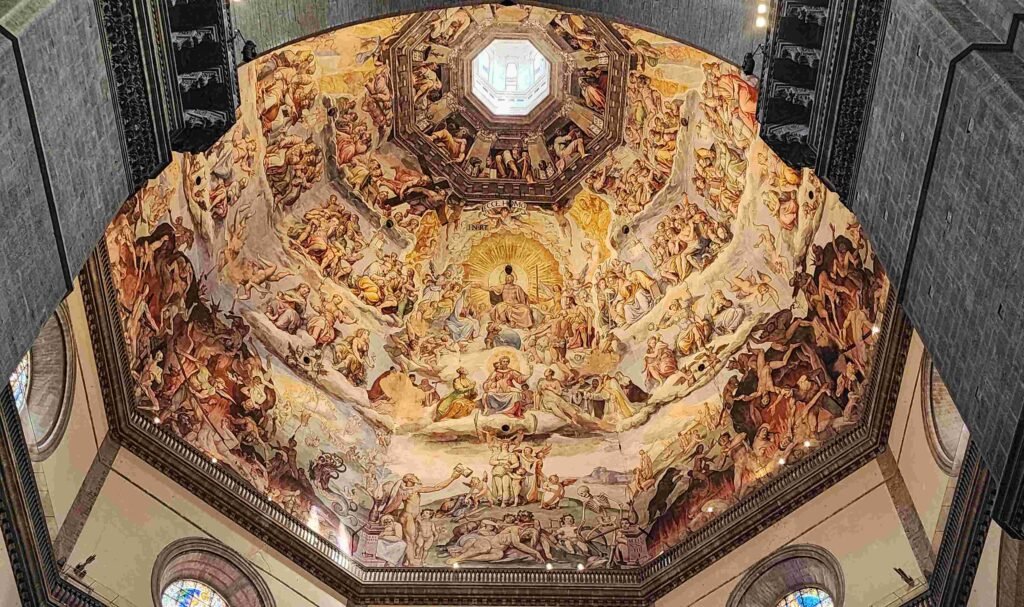 Embora ainda seja gratuito visitar o interior do Duomo – muitas catedrais têm taxa para visitação, como as de Milão ou Veneza – seu exterior é muito mais atraente que o interior. A não ser – e esta é a dica boa – que você compre o ingresso para visitar a cúpula. Depois de 414 degraus (não há elevador), uma passarela estreita proporciona uma vista incrível do interior da cúpula de Brunelleschi. No térreo, a gente não consegue ver nada, a menos que se levem binóculos ou se tenha uma câmera com zoom muito boa. Além disso, alguns degraus a mais e você pode avistar Florença e entorno . Se quiser ver como é, Silvano Formentin, professor de italiano, nos mostra em seu canal do YouTube.