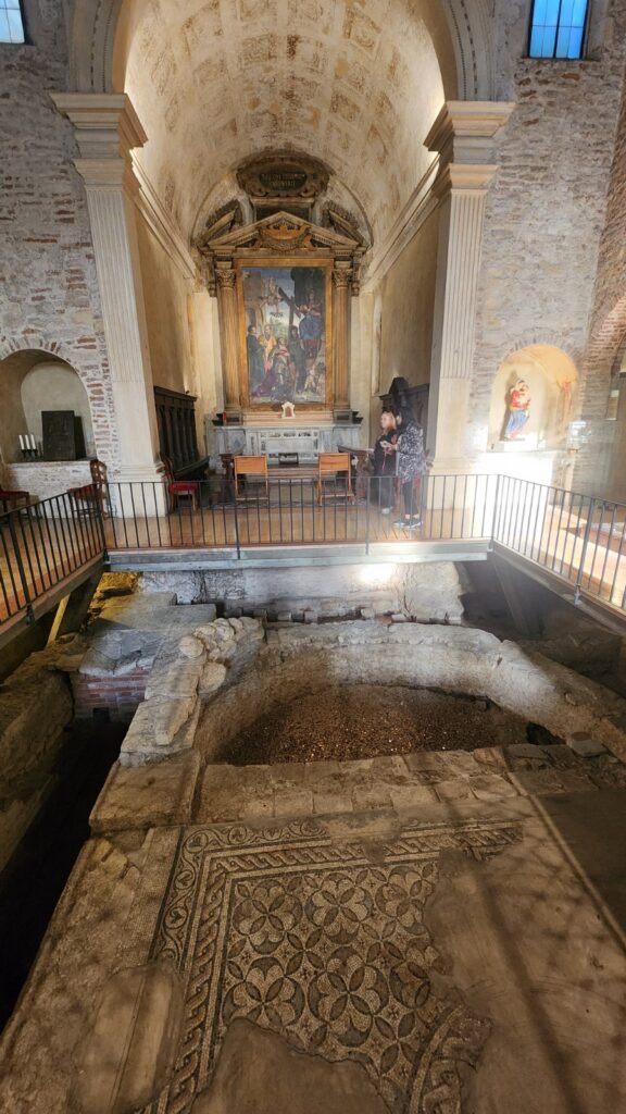 Saindo do Batistério, chegamos à igreja românica dedicada a Santa Elena, construída no século IX e restaurada no XII. Diferente da opulência de catedrais e suas obras de arte, aqui senti muita paz, somente perturbada pela presença, no meio da igreja, da escavação arqueológica que revela as fundações da primeira basílica paleocristã de Verona.