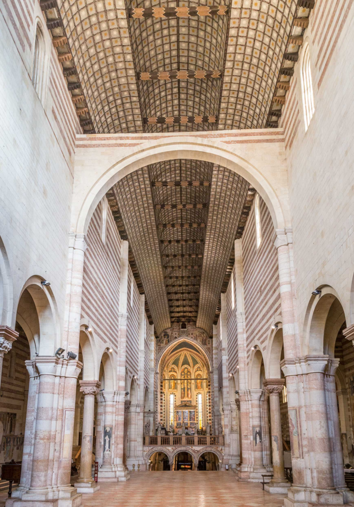A Catedral impressiona com suas enormes colunas de mármore rosado e do piso de mármore em diversas cores diante do ábside onde aparecem novamente o leões. Afrescos e capelas decoradas, com destaque para Assunção, de Ticiano (1530), única obra do mestre em Verona.