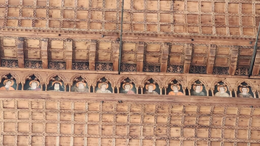 Eu fiquei literalmente de boca aberta olhando para o teto da igreja superior. São 416 bustos de santos pintados e ao redor detalhes esculpidos. Uma maquete exibe o minucioso trabalho do telhado e destaca em tamanho original o detalhe dos santos.