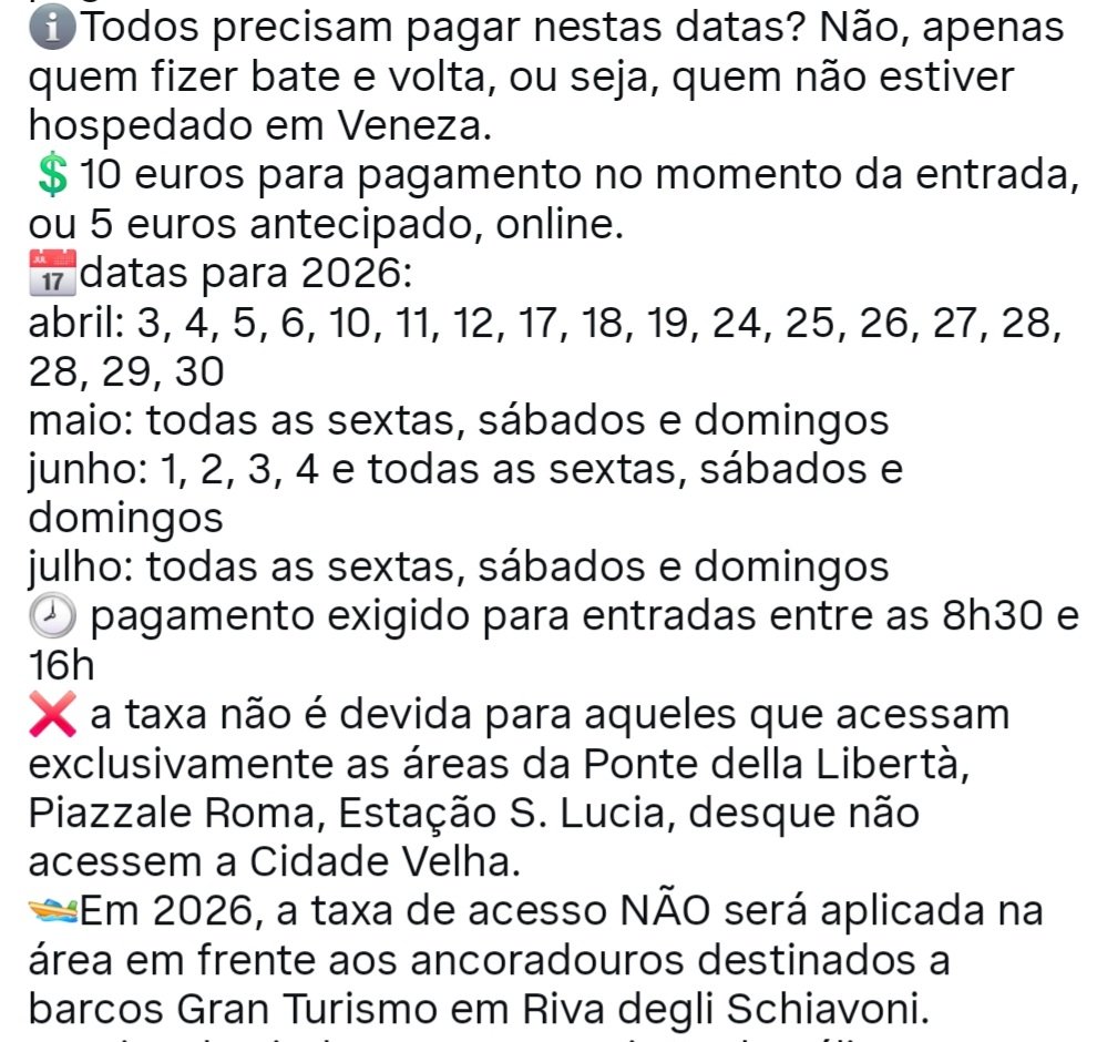 Quando começou o debate a respeito da taxa de entrada em Veneza eu fui a favor da cobrança, pensando que haveria limite de turistas, o que até agora não acontece. Espero que seja apenas o primeiro passo, porque apenas mais dinheiro nos cofres públicos não resolverá a super lotação e os problemas de Veneza.