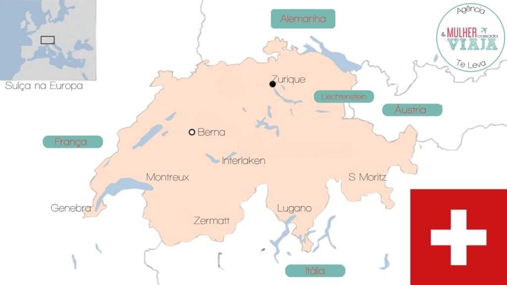 A Suíça fica no coração da Europa, cercada por França, Itália, Alemanha e Áustria — o que já diz muito sobre a diversidade cultural que você vai encontrar por lá, e que facilita a chegada e saída. E o país é dividido em regiões linguísticas: a parte alemã, a francesa e a italiana, além de uma pequena porção de romanche. Em Zurique e Lucerna, por exemplo, predomina o alemão; já em Genebra e Lausanne, o francês; enquanto no sul, em Lugano, a influência italiana é clara — e você vai perceber isso até no clima mais descontraído.