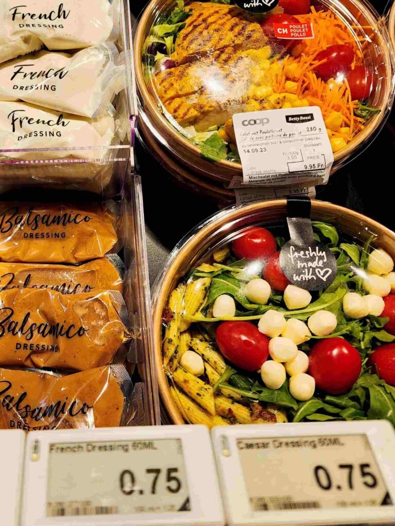 Para economizar- e todo mundo faz isso, turistas e locais – compre um prato feito num supermercado. Coop e Migros têm lojas em toda parte e sempre tem uma boa salada, um bom sanduíche ou mesmo um prato quente. Talheres de plástico e temperos são vendidos – e sacolas plásticas. E as pessoas comem nas praças, sentadas à biera de rios e lagos.